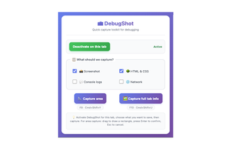 DebugShot là một tiện ích mở rộng Chrome đa năng được thiết kế để đơn giản hóa quy trình ghi lại lỗi trong các ứng dụng web. Tiện ích miễn phí này kết hợp nhiều công cụ thiết yếu vào một giao diện, cho phép người dùng chụp ảnh màn hình, chọn các phần tử DOM và truy cập thông tin bảng điều khiển và mạng. Thiết kế thân thiện với người dùng của nó giúp dễ dàng tiếp cận cho cả nhà phát triển và kiểm thử viên, nâng cao năng suất trong khi gỡ lỗi các trang web.